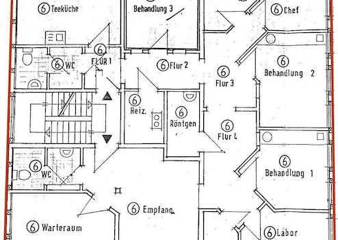 Wände/Bodenbeläge: PVC-Belag, Warte- und Empfangsraum sowie Flur mit Teppichbelag.