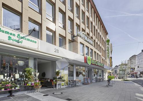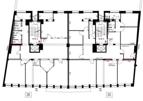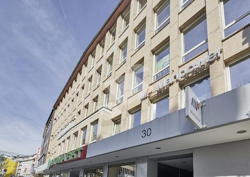 Über eine optisch zusammenhängende hellbraun changierende Natursteinfassade bilden die beiden Hausnummern 28 und 30 einen breiten 6-geschossigen Gebäudekomplex. Dessen Erdgeschoss ist geprägt von thematisch unterschiedlichen Einzelhandelsgeschäften. Über die beiden von der Straße zurückversetzten Hauseingänge gelangt man jeweils in einen repräsentativen Foyerbereich und von dort weiter mittels Aufzug oder Treppenhaus in die einzelnen Obergeschosse.