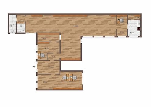 Neben der großen geräumigen Produktionshalle befinden sich auch Büroräume, sowie Sanitäranlagen, Lagerräume und eine Küche.