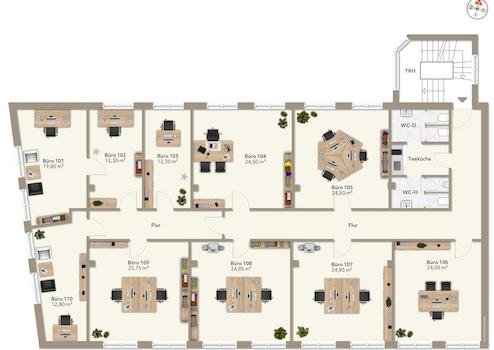 Ihr zukünftiges Büro liegt im 1. Obergeschoss des Hauses. Durch einen langen Flur gelangen Sie zu dem Einzelbüro mit einer Gesamtfläche von rund 24,50 m². Jedes Einzelbüro ist mit modernem Laminat und großen Fenstern ausgestattet und bietet mit rund 24,50 m² genug Platz für mehr als nur einen Schreibtisch. Eine gemeinschaftliche Teeküche sorgt für regen Austausch mit den Kollegen. Auch getrennte Toiletten dürfen hier nicht fehlen. Des Weiteren sind noch freie Stellplätze auf dem großen Parkplatz als Zusatzoption verfügbar. Als Gesamtpaket bietet die halbe Büroetage einen perfekten Ort zum Arbeiten und Weiterentwickeln.