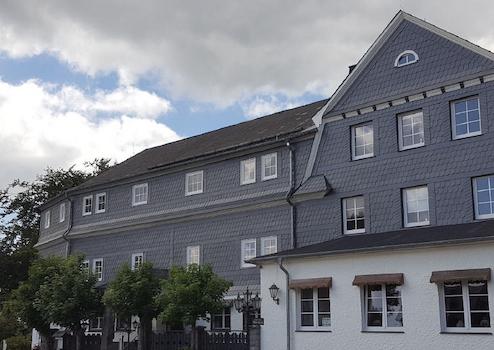 Die ebenfalls neu verschieferte Fassade des Hauses im sauerländer Stil verleiht dem Gebäude einen besonderen Charme.
