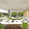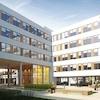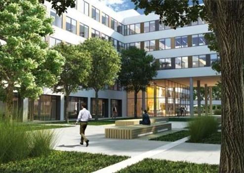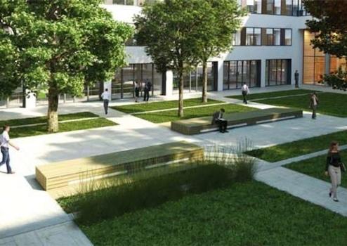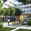 Campuscharakter: Zwei offene, grüne Innenhöfe und begrünte Dachterrassen mit Sonnensegel.