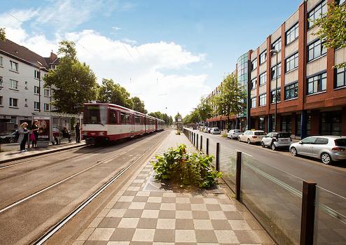Auch der öffentliche Nahverkehr ist hervorragend angebunden: Haltestellen der Linien U75, 734 und 736 befinden sich direkt vor dem Gebäude und bringen Sie zügig zum Düsseldorfer Hauptbahnhof. Der internationale Flughafen Düsseldorf ist in rund 18 Minuten erreichbar.