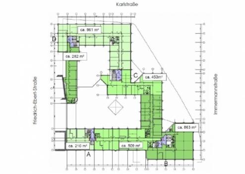 Vier separate Gebäudeteile (A, B, C, D) sichern den Mietern eine große Individualität zu. Darüber hinaus können in der objekteigenen Tiefgarage Stellplätze für Mitarbeiter und Besucher angemietet werden. Die flexiblen Grundrisse bieten die Möglichkeit, individuelle Aufteilungen (z.B. Großraum- oder Einzelbürostrukturen) zu verwirklichen. Darüber hinaus trägt die ansprechende Natursteinfassade zu einem repräsentativen Gesamteindruck des Büro- und Geschäftshauses bei. Insgesamt 7 Personenaufzüge sorgen für einen reibungslosen Zugang zu den Büroflächen.