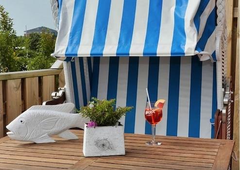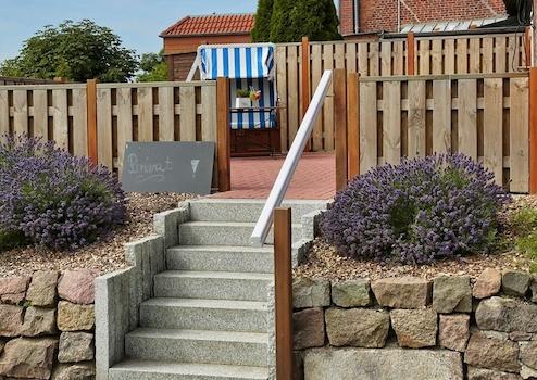 Die Deichterrasse, welche sich unmittelbar auf dem Nordseedeich und damit nur wenige Schritte vom der Nordsee entfernt befindet, lädt ca. 90 weitere Gäste zum Verweilen ein.