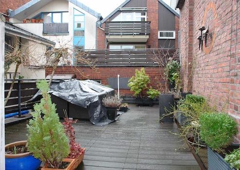 3-Zimmer-Maisonette-Wohnung mit großer geschützter Terrasse und eigenem Hauseingang mit Empfangsdiele auf der Erdgeschossebene. Auf der mittleren Ebene der Wohnung befinden sich das Gäste-WC, der Wohnbereich mit offener Küche sowie die ca. 27 m² große Terrasse. Im Obergeschoss befinden sich eine weitere Diele, zwei Schlafzimmer und ein Badezimmer mit Wanne und Dusche.