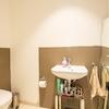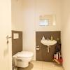 Die Kundentoilette sowie die Personaltoilette ist mit modernen Sanitärobjekten ausgestattet und halbhoch mit hellen Fliesen gefliest.