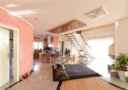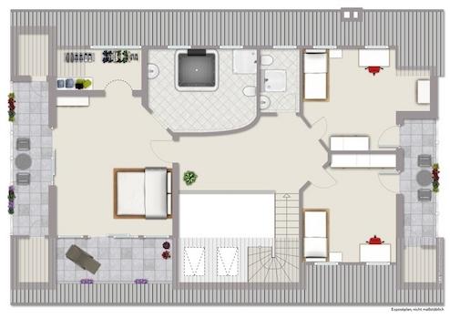 Das Dachgeschoss verfügt über Galerie, 2 Schlafzimmer (jeweils mit eigenem Bad), Ankleide, Büro und eine sonnige Loggia.