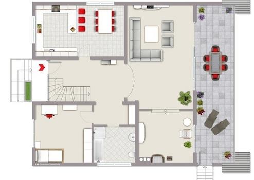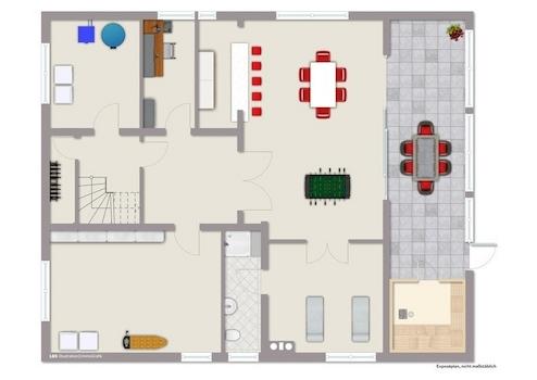 Großzügiges Einfamilienhaus mit Außenpool. Im Erdgeschoss befinden sich Wohn-/Kaminzimmer, Gästezimmer, Wohnküche, Tageslichtbad und eine großzügige Terrasse .