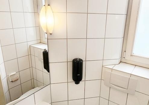 Eine Toilette befindet sich im Hausflur des Erdgeschosses und ist durch einen Schlüssel zugänglich.