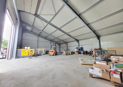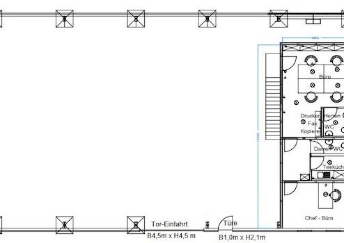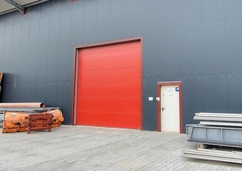 Die Hallenfläche kann über ein besonders großes Sektionaltor (4,5 m x 4,5 m) angedient werden. Zusätzlich ist eine separate Eingangstüre vorhanden. Die Hallenhöhe beträgt mindestens 4,0 Meter (zur Rückwand) und maximal bis 7,5 Meter (zur Vorderwand).