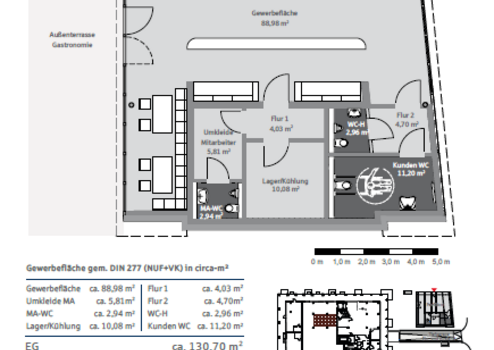 Im Erdgeschoss befinden sich 8 attraktive Gewerbeeinheiten. Neben der Sparkasse Holstein und Budnikowski sind noch 6 weitere Gewerbeeinheiten von ca. 50-250 m² zu vermieten, die "ready to design" mit WC-Anlage angeboten werden, so dass die Innenausstattung individuell erfolgen kann.
