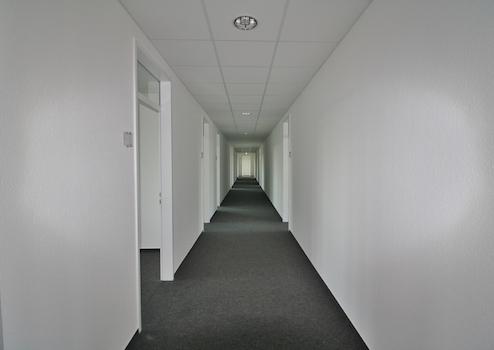 Ein langer Flur, wo jeweils rechts und links die Büroräume abgehen, führt bis in den hinteren Gebäudeteil.