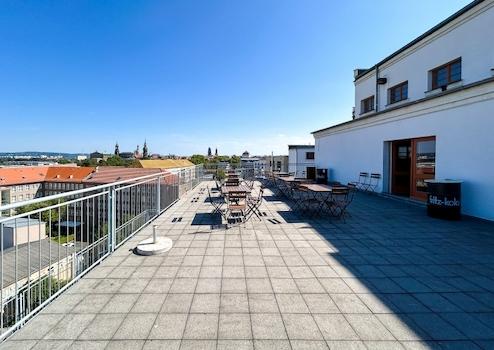 Ein Highlight ist die großzügige Dachterrasse mit rund 100 m², die einen beeindruckenden Blick über die Dresdner Innenstadt eröffnet – ideal für ein Café, eine Bar, Eventlocation oder eine kleine Kantine.