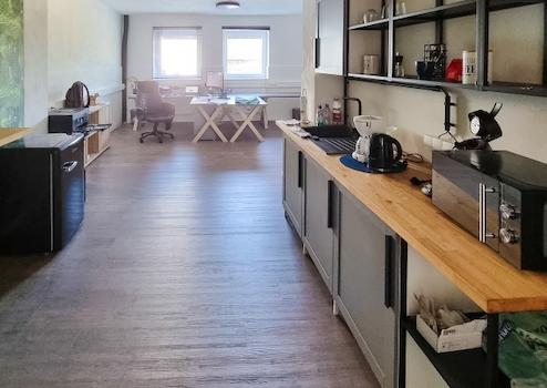 Hier finden Sie alles, was Sie brauchen: Bürofläche, Lagermöglichkeiten, Teeküchenanschluss, eine sanitäre Anlage usw.