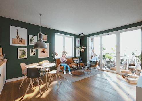 Die Wohnbereiche sind offen gestaltet und profitieren von großzügigen Fensterfronten, wodurch die Räume mit viel natürlichem Licht durchflutet werden. Umlaufende (Dach-) Terrassen und Balkone sorgen für eine großzügige Möglichkeit, sich im Freien aufzuhalten.