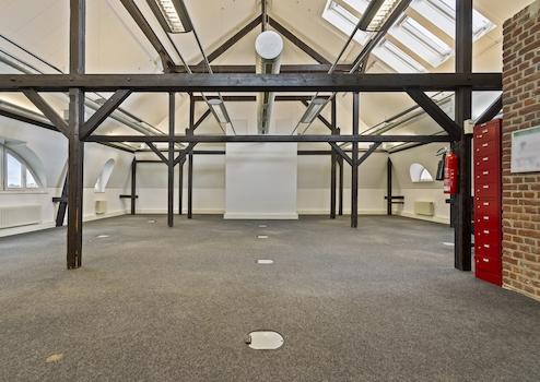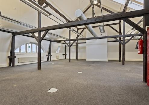 Diese attraktive Büroeinheit umfasst ca. 212 m² und befindet sich im 2.OG eines denkmalgeschützten Gebäudes aus dem Jahr 1895, das Teil eines größeren, historisch bedeutsamen Komplexes ist. Der flexibel aufteilbare Büroraum zeichnet sich durch seine offene und helle Atmosphäre aus. Die Raumgestaltung wird stark von den freiliegenden Holzträgern dominiert, die die Dachkonstruktion stützen und dem Raum einen rustikalen, aber zugleich modernen Charakter verleihen.