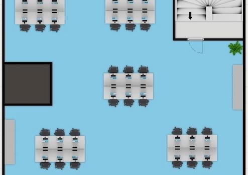 Zusammengefasst wirkt der Büroraum modern, geräumig und hell, mit einer ausgewogenen Mischung aus rustikalen und industriellen Elementen.