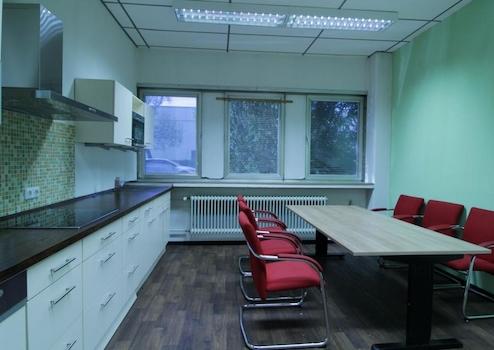 Die Fläche überzeugt durch ihre flexible Aufteilung, die sowohl für Ausstellungszwecke als auch als Büro- und Besprechungsraum genutzt werden kann. Eine voll ausgestattete Küche steht zur Verfügung und bietet ausreichend Platz für Mitarbeitende.