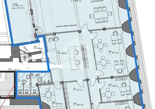 Die freien Büroflächen in den oberen Geschossen können individuell nach Mieterwunsch ausgebaut und ausgestattet werden. Die hohen Decken der Mietbereiche verleihen den Flächen einen loftähnlichen Charakter. Insbesondere große Räume sind gut darstellbar aber auch eine kleinteilige Einzelbüroaufteilung ist möglich. Über die großen Fensterflächen sind die Räume sehr gut belichtet.