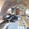 Der Gastraum besticht durch sein historisches Interieur, das die ehemalige Kochanlage authentisch in Szene setzt.