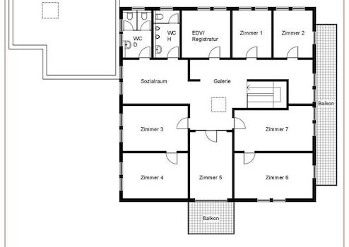 Im Obergeschoss stehen Ihnen zusätzlich sieben klimatisierte Büro-/Praxisräume, ein klimatisierter Serverraum und ebenfalls eine Teeküche als Sozialraum zur Verfügung.