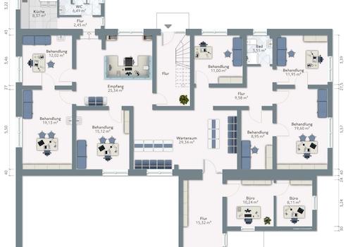 - Nutzfläche ca. 216 m² verteilt auf 9 Räume, getrennte Toiletten, Empfang, Wartebereich und Aufenthaltsraum mit Küche