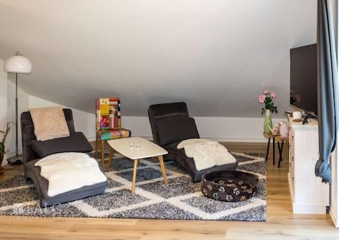 Im 1. OG gelangen Sie durch eine Zwischentür in den Wohnbereich, gegenüber ist der Hinterausgang in den Garten, ein Gäste-WC finden Sie im Flur dazwischen. Beim Eintritt in den fast 50 m² großen Wohnbereich erleben Sie sofort die Großzügigkeit und Gemütlichkeit eines Wohnzimmers mit großen Fensterflächen, einem wunderschönen Kamin mit beheizter Sitzbank, großen Lounge-Sitzmöbeln und einem kleinen Esstisch im Erker zum Garten. Alles hier vermittelt ein angenehmes, entspanntes Wohngefühl. Wohnzimmer und Esszimmer sind mit einem offenen Durchgang verbunden, der große Esstisch bietet Platz für 8 - 10 Personen und ist der Familientreffpunkt, an dem neben den Mahlzeiten auch gearbeitet, gelernt, gespielt und vielfältigen Hobbies nachgegangen werden kann. Ein weiteres Highlight ist die große, umlaufende Terrasse, auf die man vom Wohnzimmer aus gelangt und die Platz für kleine und große Sitzecken bietet, für Balkonpflanzen und z.B. auch einen Whirlpool.