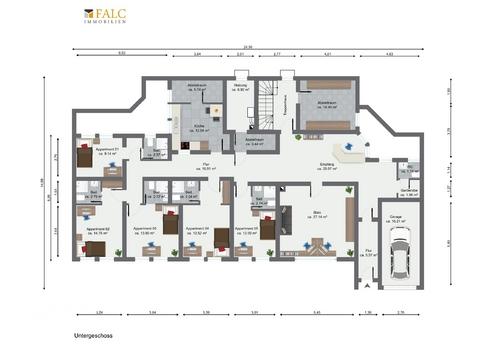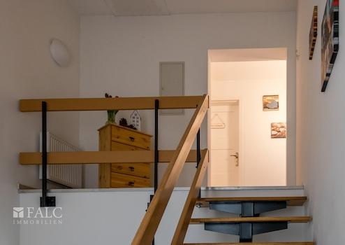 Vom Hauseingang geht es über eine halbe Treppe in den großzügigen Eingangs- und Empfangsbereich. Durch eine Zwischentür gelangen Sie in den Bürobereich mit insgesamt 6 Zimmern, einem Frühstücksraum und einer Küche sowie einem großen Abstellraum. Auf der rechten Seite geht es in das Treppenhaus zur darüberliegende Wohnung. Der Heizraum befindet sich neben dem Treppenhaus.