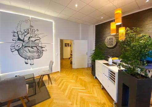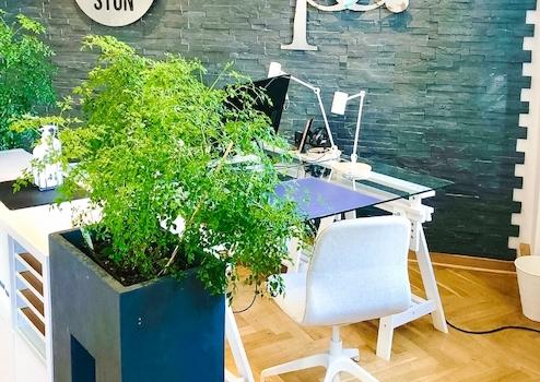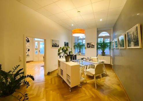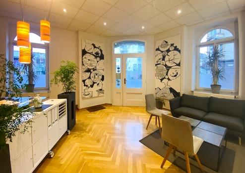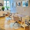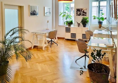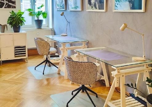 Hippes Coworking-Space mit möblierter, hochwertiger Ausstattung: In diesem kreativen Büro stehen drei Arbeitsplätze mit Schreibtisch zur Verfügung.