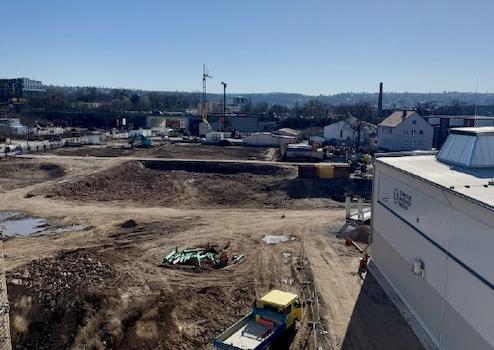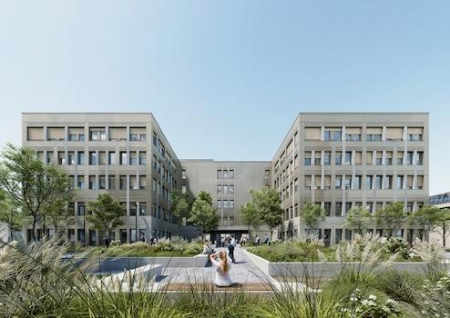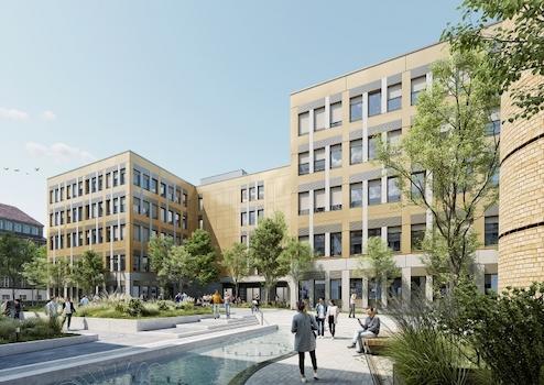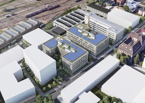 Bis voraussichtlich Sommer 2027 entsteht hier ein Büro- und Laborkomplex mit einer Gesamtfläche von ca. 17.338 m², davon 15.360 m² mieterspezifische Fläche möglich, verteilt auf 4 Etagen. Es können Flächen von 350 m² bis 1.450 m² pro Etage angemietet werden.
