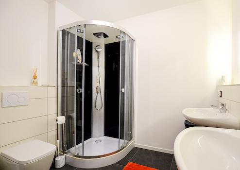 • Badezimmer mit Glasdusche, WC, zwei Waschbecken und Waschmaschinenanschluss