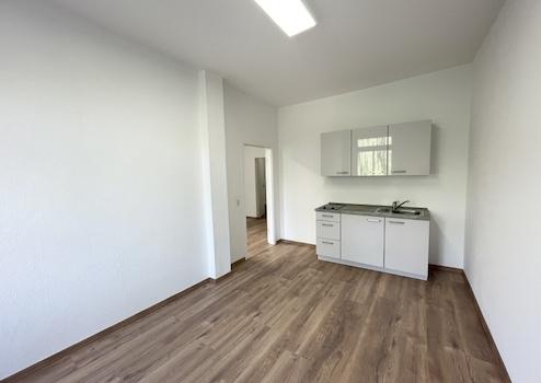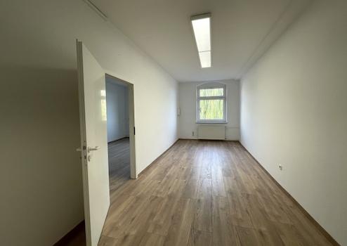Zu dem Büro gehören zwei Räume sowie eine Einbauküche.