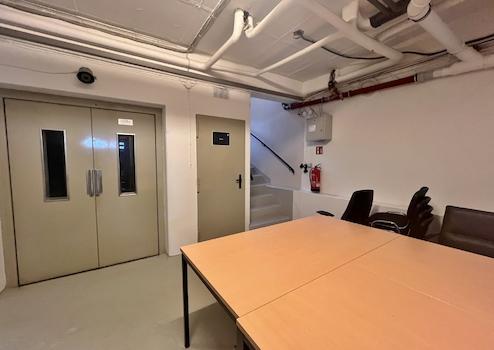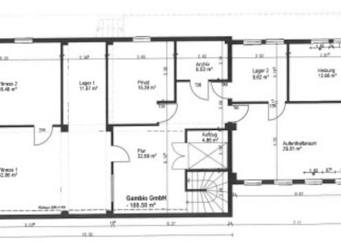 Über eine Treppe gelangt man in den Kellerbereich, wo ca. 170 m² große Lagerfläche zu finden ist. Diese verteilt sich auf zwei große und drei kleine Lagerräume sowie einen großen Aufenthaltsraum mit angrenzender Teeküche.
