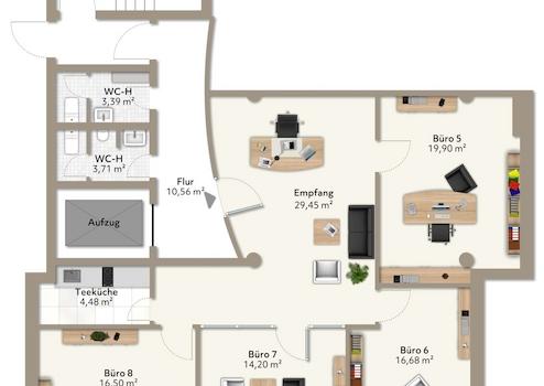 - Bürofläche: 115, 56 m², im 5. Obergeschoss eines modernen Geschäftshauses inmitten der Innenstadt