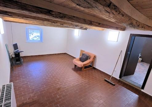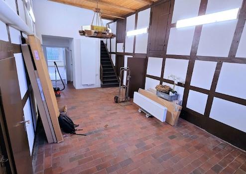 Die offenen und aufgearbeiteten Holzbalkendecken verleihen den Räumen eine einladende Atmosphäre und verbinden den Charme der Vergangenheit mit zeitgemäßem Komfort.