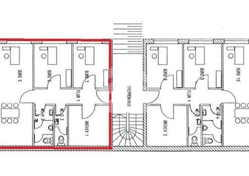 Die 1992/93 errichteten zweigeschossigen kleineren Bürogebäude mit jeweils 316 m² setzen sich aus 4 Einheiten mit je ca. 79,00 m² zusammen. Die Mietbereiche können entsprechend des benötigten Raumprofils ausgebaut und ausgestattet werden. Die Einheiten im Erdgeschoss haben eine Verbindung zu den Hallenflächen. Das Hauptgebäude verfügt insgesamt über 1.500 m² Mietfläche.