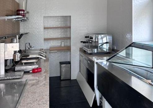 Das ebenfalls geflieste Café/Bäckerei verfügt über einen Verkaufsraum mit geplanter Theke und nebenliegendem Gastraum. Eine Küche befindet sich im rückwärtigen Bereich.