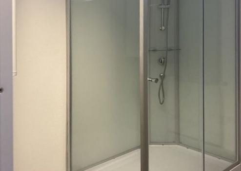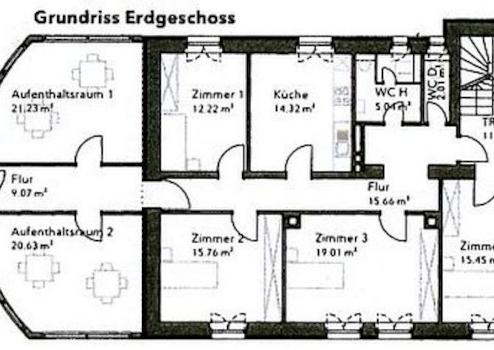 Das Erdgeschoss kann sowohl vom Treppenhaus als auch über den Anbau begangen werden. Die EDV-Verkabelung verläuft in Kanälen. Der Serverschrank ist im Aufenthaltsraum untergebracht. Ein Büroraum wurde zu einem Bad mit drei Duschen und Waschmaschinenanschluss umgebaut. Die WCs sind hell gefliest.