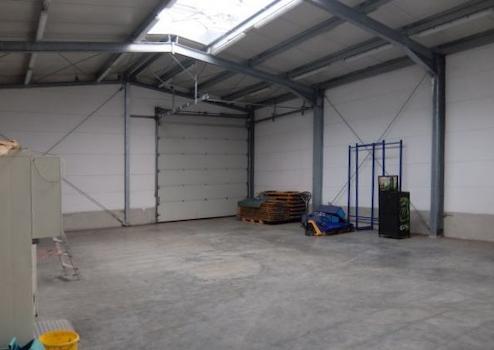 Die angebaute Halle mit Betonboden wurde in Skelettbauweise errichtet. Sie ist über ein ca. 3,50 m x 5,00 m großes Sektionaltor befahrbar. Eine Lichtkuppel und Deckenleuchten sorgen für gute Belichtung.