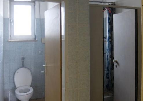 Im Erdgeschoss befindet sich die geflieste Verkaufsfläche. Sie ist über eine große doppelseitige Glasschiebetür und über einen Nebeneingang begehbar. Das Büro ist ebenso wie das Duschbad mit WC gefliest und mit Deckenleuchten ausgestattet.