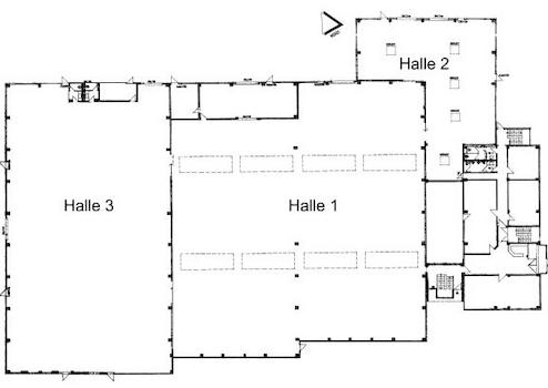 Die Halle 3 mit Fußbodenheizung hat eine Höhe von ca. 7,50 m und ist mit Betonboden. Die Belichtung erfolgt über Lichtbänder und einer umlaufenden Fensterfront. Ein Meisterbüro mit angrenzenden WCs sind abgetrennt. Die EDV- und Telefonverkabelung verläuft in Brüstungskanälen. Neben dem Meisterbüro befindet sich ein Rolltor mit ca. 3 m Breite und ca. 3,70 m Höhe. In der Halle sind noch zwei weitere gleichgroße Rolltore verbaut.