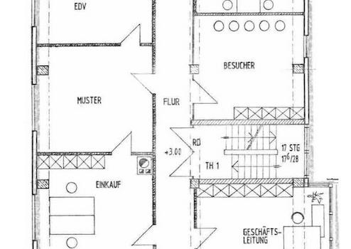 Das Obergeschoss ist aufgrund der vielen Fenster sehr hell und freundlich. Die Büroräume sind überwiegend mit Laminat und Vinylboden, der Flur mit Naturstein, ausgelegt. Die EDV- und Telefonverkabelung verläuft in Kabelkanälen und Bodentanks. In den abgehängten Decken sind Leuchten integriert. Vom Sekretariat aus ist sowohl das Chefbüro als auch die Küche erreichbar. Die WC-Anlage ist hell gefliest.