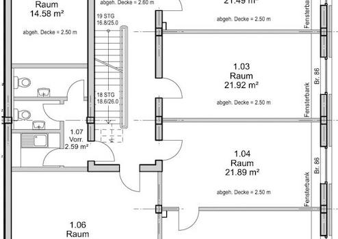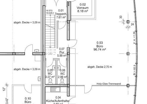 Aufenthaltsraum, Abstellraum sowie WCs untergebracht. Durch die großen Fenster sind die überwiegend mit Teppichboden ausgelegten Büros sehr hell und freundlich. Die Teeküchen sind mit Kunststoffböden und die Sanitärräume und WCs sind gefliest. In den abgehängten Decken sind Leuchten integriert. Die EDV-Verkabelung verläuft in Brüstungskanälen.