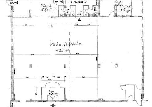 Die Verkaufsfläche wurde 2022 komplett entkernt und ist sowohl über eine vollverglaste doppelflügelige Türe als auch über zwei nebeneinanderliegende Türen erreichbar. Sie wird nach den Wünschen des Mieters gestaltet. In die abgehängte Decke sind die Beleuchtung und die Klimaanlage integriert. Im rückwärtigen Teil des Verkaufsraumes befinden sich zusätzlich vier Lichtkuppeln. Der Boden ist gefliest. Von der Verkaufsfläche sind die Lagerfläche und die halbhoch hell gefliesten WCs für Kunden und Mitarbeiter abgetrennt.