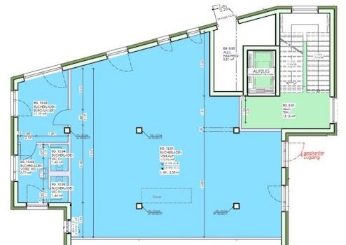 Im Erdgeschoss befindet sich die Laden- /Ausstellungsfläche. Hier ist geplant neben der großen Ladenfläche auch einen Lager- oder Sozialraum und zwei WCs zu erstellen. Die Fläche kann derzeit nach den Wünschen des Mieters aufgeteilt und ausgestattet werden.