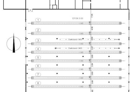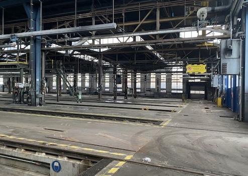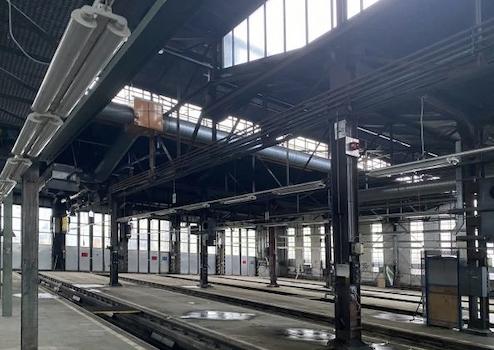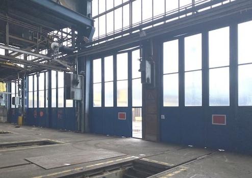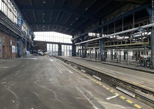 Die Halle hat an den Stirnseiten jeweils fünf ca. 6 m hohe und 4,40 m breite Tore. Sie ist mit Industrieestrich und 8 Montagegruben ausgestattet. Eine umlaufende Fensterfront und das Scheddach bringen viel Licht in die Halle. Ein Kran mit 16/3 t Nutzlast ist verbaut, derzeit nicht einsatzbereit.