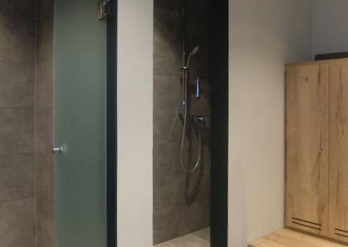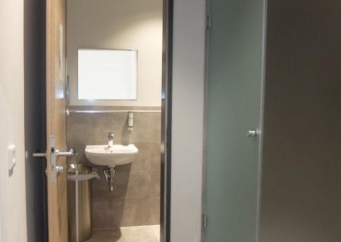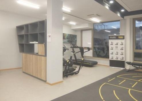 Die klimatisierte und barrierefreie Fläche im Erdgeschoss ist aufgrund der vielen Fenster mit Blick ins Grüne sehr hell und freundlich. Sie ist aufgrund der Leichtbauweise flexibel auf neue Bedürfnisse anpassbar. Der Zugang ist sowohl über das Treppenhaus als auch über einen Außeneingang möglich. Die Schaufenster und die vollverglaste Eingangstüre bieten gute Werbe- und Präsentationsmöglichkeiten. Es ist überwiegend hochwertiger PVC, Fliesen und Vinyl verlegt. In die abgehängten Akustikdecken sind Leuchten und Lautsprecher integriert. Die EDV-Verkabelung verläuft in Brüstungskanälen. Der Empfangsbereich ist durch eine Glaswand vom Wartebereich abgetrennt. Zwei Umkleideräume sind modern gefliest und jeweils mit zwei Duschen ausgestattet. In der WC-Anlage ist neben einem Damen- und Herren-WC auch das Personal-WC untergebracht. Vom großen Ausstellungs- oder Veranstaltungsraum mit der über die ganze Breite sich erstreckenden fast bodentiefen Fensterfront sind zwei Büros abgetrennt, wovon eines mit einer Lichtkuppel ausgestattet ist. Im Aufenthaltsraum mit abgehängter Decke mit Deckenspots ist eine Küchenzeile mit Geschirrspüler verbaut. Vor dem Gebäude befinden sich 3 zur Erdgeschossfläche gehörende Außenstellplätze. Darüber hinaus sind der Fläche drei Tiefgaragenstellplätze zugeteilt.
