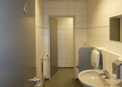 Ceranfeld und Geschirrspüler eingebaut. In der hell gefliesten Umkleide mit Dusche ist die Gasheizung untergebracht. Die WCs sind hell deckenhoch gefliest. Über dem Büro- und Sozialtrakt befindet sich eine Mezzanine Fläche.