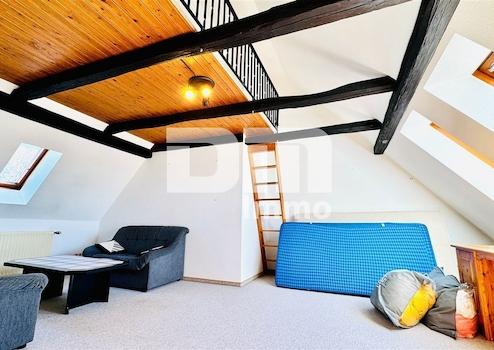 Im Dachgeschoss des 1. Gebäudeteils teilen sich vom zentralen Flur / Dielenbereich ein saniertes Badezimmer mit Dusche, ein schönes Maisonettestudio, sowie 2 große Wohnbereiche ab.